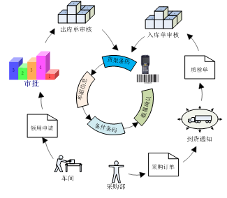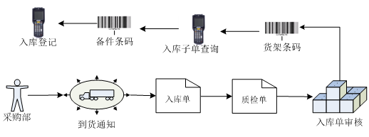 采購流程始于采購部門的到貨通知單,從到貨通知單導(dǎo)入物料及數(shù)量,系統(tǒng)確定備品備件編碼,生成入庫單及需要質(zhì)檢的物料生成相應(yīng)的質(zhì)檢單。質(zhì)檢通過后,系統(tǒng)根據(jù)預(yù)設(shè)的條碼規(guī)則生成條碼,二維條碼可以區(qū)分每件備品備件。根據(jù)入庫單生成的庫位信息,掃描貨架及物料條碼,掃描入庫,完成入庫登記。