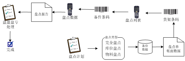 庫存盤點包括完全盤點、按庫位盤點、按物料盤點,首先系統(tǒng)會備份盤點數(shù)據(jù),生成盤點備品備件的帳面數(shù)據(jù)。根據(jù)盤點單上的貨架信息,手持終端掃描后系統(tǒng)顯示該庫位需盤點的物料及數(shù)量,掃描物料條碼獲取物料類信息,盤點數(shù)量并錄入。盤點完成后生成盤點報告及盤盈盤虧情況,以進行盤盈盤虧處理。