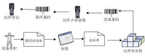 領(lǐng)用出庫流程起始于備品備件使用部門的申請單,經(jīng)審批生成并引入到出庫單,出庫單中包括物料信息、出庫庫位、出庫數(shù)量,出庫單包括物料編碼信息。根據(jù)出庫單生成的庫位信息,掃描貨架及物料條碼,掃描出庫,完成出庫登記。