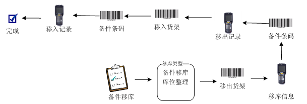 隨著出入庫流水,同一備品備件會分散在不同的庫位,有時需要調(diào)整以集中存儲,便于以后的出入庫或庫位整理,分為物料移位、庫位整理。物料移庫以物料為主,將某一種備品備件從一個庫位移到另一個庫位;庫位整理以移空某庫位為主,將庫位中殘余的備品備件分類移到不同的庫位。首先掃描移出庫位,手持終端彈出需要移位的備品備件及移入的庫位,掃描移出備品備件后將其移至移入庫位后掃描物品條碼確認。