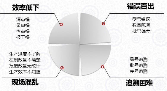 3、現(xiàn)場混亂-生產(chǎn)進(jìn)度不了解、在制數(shù)量不清楚、報(bào)廢數(shù)量無統(tǒng)計(jì)、生產(chǎn)效率不知道