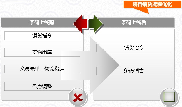 盤點(diǎn)的體系也得到了極大的改善,逐漸采用每日循環(huán)盤點(diǎn)的方法進(jìn)行庫存管理;因?yàn)殇N貨出庫撿貨和裝箱運(yùn)用條碼,也使得出庫效率大大提高