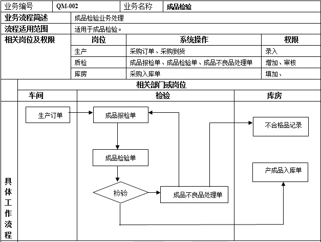 1、 車間在【物料需求計(jì)劃】中填制生產(chǎn)訂單推式生成成品報(bào)檢單。 2、 檢驗(yàn)崗位在【質(zhì)量管理】中由成品報(bào)檢單參照生成成品檢驗(yàn)單對(duì)存貨進(jìn)行檢驗(yàn)。 3、 庫(kù)房在【庫(kù)存管理】中由成品檢驗(yàn)單對(duì)合格品和降級(jí)品進(jìn)行入庫(kù),參照生成產(chǎn)成品入庫(kù)單。 4、 檢驗(yàn)崗位在【質(zhì)量管理】中對(duì)不良品進(jìn)行處理,由成品檢驗(yàn)單參照生成不良品處理單。對(duì)于進(jìn)行抽檢檢驗(yàn)不合格存的貨進(jìn)行分揀,由不良品處理單參照生成成品報(bào)檢單。 |