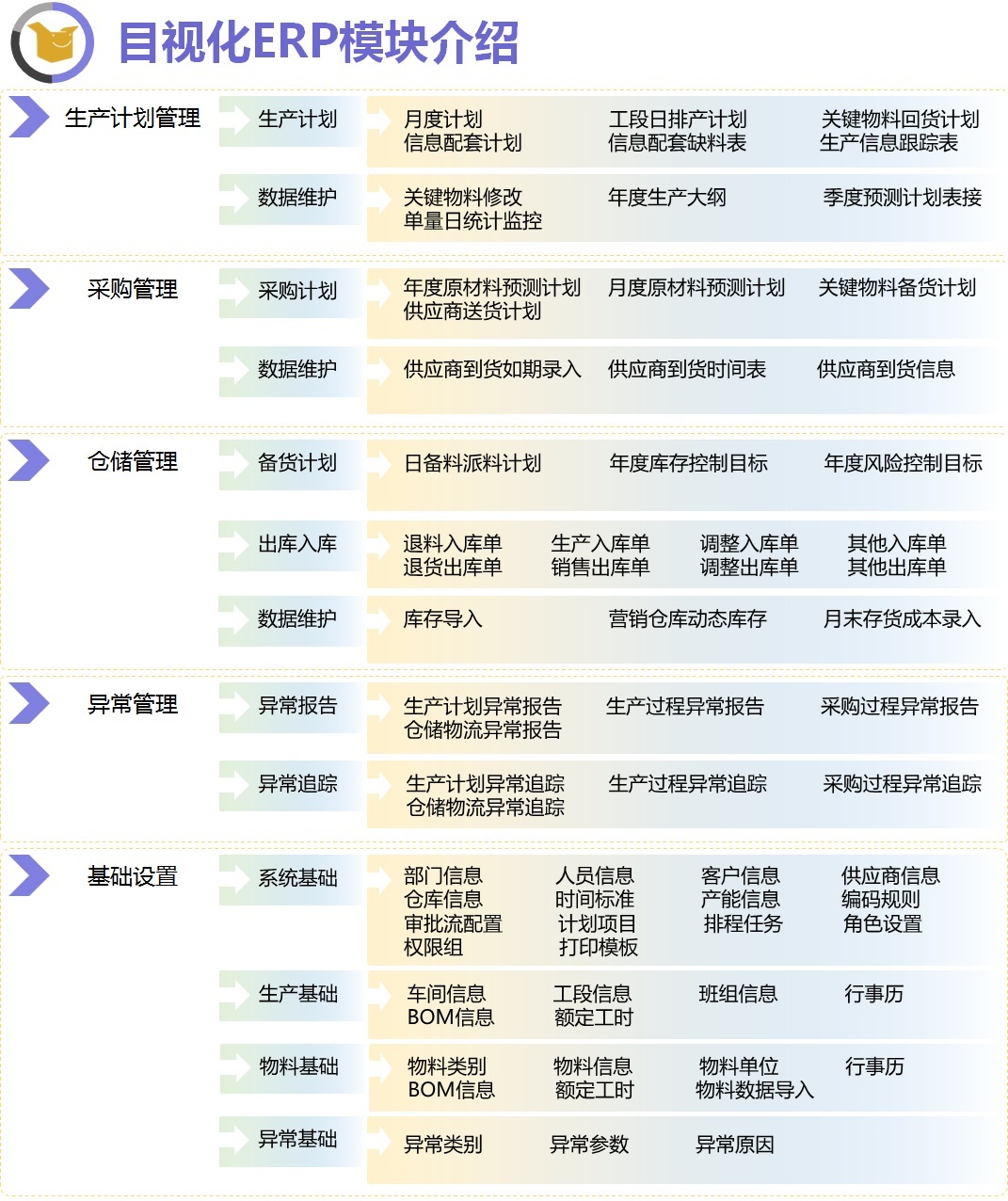 項目由4大核心模塊構成:基礎資料模塊、業(yè)務功能(生產(chǎn)計劃管理、采購管理、倉儲物流管理展、生產(chǎn)過程管理)模塊、數(shù)據(jù)采集模塊、查詢報表及可視化展示模塊。