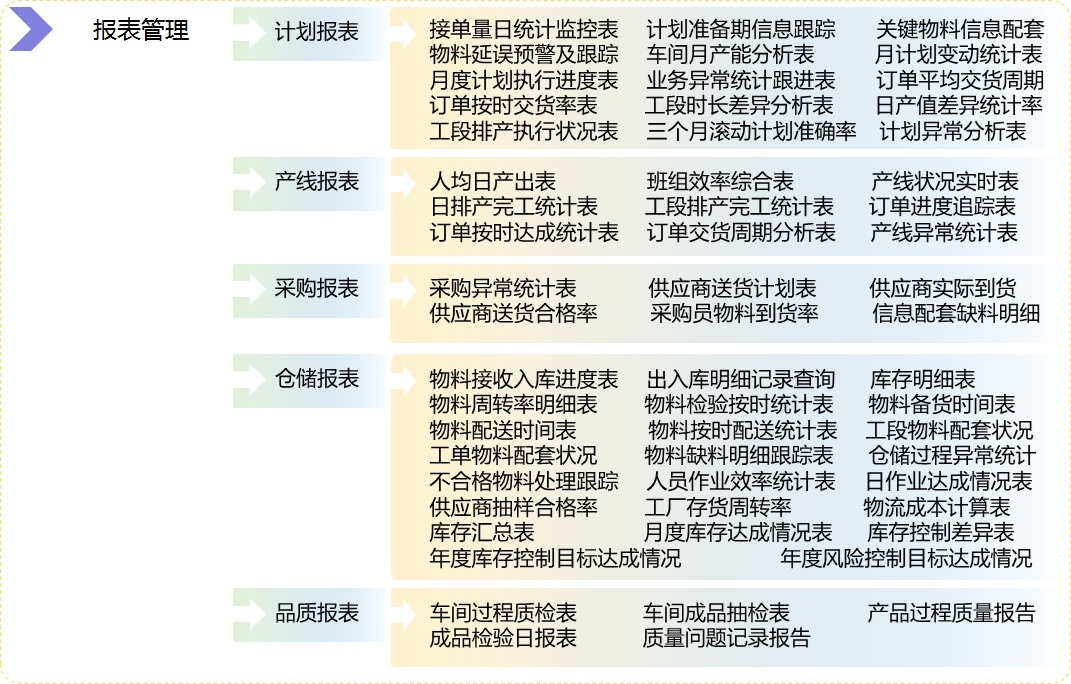⑤ 生產(chǎn)報表完善,《生產(chǎn)進度表》《產(chǎn)品進度明細表》《實際人員.時間.報工表》等生產(chǎn)分析類報表,為決策者提供強大助力;