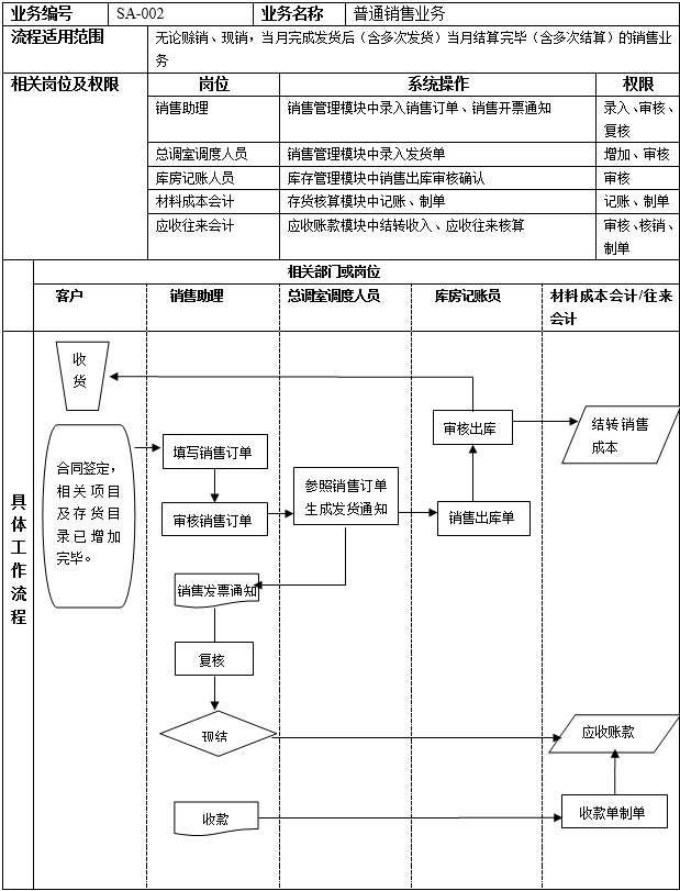 1、 銷售業(yè)務(wù)員與客戶簽訂銷售合同,銷售助理依據(jù)簽審?fù)戤叺?/span>銷售合同審批單在【銷售管理】模塊錄入銷售訂單并審核。 2、 產(chǎn)品生產(chǎn)完畢完工入庫后,總調(diào)室調(diào)度人員在【銷售管理】模塊根據(jù)銷售訂單生成銷售發(fā)貨通知單;3、 銷售助理根據(jù)客戶開票需求,查詢銷售發(fā)貨通知單審核狀態(tài),對已審核的銷售發(fā)貨通知單在【銷售管理】模塊中根據(jù)銷售發(fā)貨通知單生成銷售開票通知單,進(jìn)行復(fù)核處理; 4、 財(cái)務(wù)往來會計(jì)根據(jù)銷售助理復(fù)核后的銷售開票通知單,手工開具銷售專用發(fā)票、銷售普通發(fā)票,并在【應(yīng)收賬款】模塊中對銷售開票通知單進(jìn)行審核處理,形成應(yīng)收賬款往來; 5、 【銷售管理】模塊中審核后的銷售發(fā)貨單通知單自動傳遞到【庫存管理】模塊生成銷售出庫單。實(shí)物出庫后,庫房記賬人員根據(jù)將銷售出庫單一式三聯(lián),庫房保管人員、庫房留存、材料成本會計(jì))進(jìn)行打印留存,在【庫存管理】模塊對銷售出庫單進(jìn)行審核,材料成本會計(jì)在【存貨核算】模塊對銷售出庫單進(jìn)行單據(jù)記賬,系統(tǒng)自動結(jié)轉(zhuǎn)銷售出庫成本,材料成本會計(jì)進(jìn)行制單生成銷售成本結(jié)轉(zhuǎn)憑證。 |
