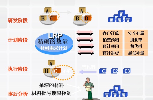 2:在計(jì)劃階段,系統(tǒng)提供MRP/LRP,目的是用最少的料/最短占用時(shí)間的料來滿足生產(chǎn)。