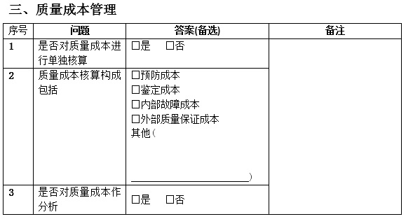 17、是否對質(zhì)量成本進(jìn)行單獨(dú)核算?質(zhì)量成本核算構(gòu)成包括?(EX: 預(yù)防成本、鑒定成本、內(nèi)部故障成本、內(nèi)部故障成本)