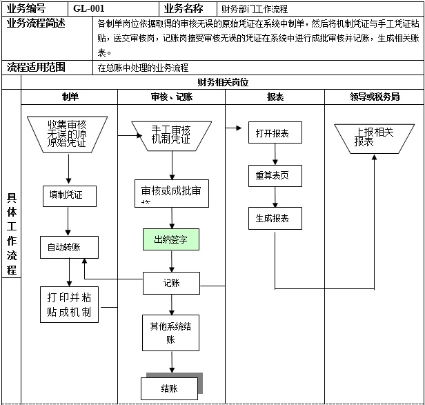 1、 財(cái)務(wù)部各制單崗位根據(jù)收集的原始憑證,按照業(yè)務(wù)特點(diǎn)有的直接在【總賬】模塊中制單,有的在各功能模塊根據(jù)已錄入的審核無(wú)誤的業(yè)務(wù)單據(jù)直接生成憑證。某些憑證可進(jìn)行自定義結(jié)轉(zhuǎn)憑證,如計(jì)算本月應(yīng)交稅金,但相關(guān)科目必須先記賬。 2、 將錄入到系統(tǒng)的憑證,打印并與原始單據(jù)粘貼轉(zhuǎn)交審核崗位。 3、 審核崗位對(duì)制單崗位傳遞來(lái)的憑證進(jìn)行審核。并在【總賬】模塊中執(zhí)行成批審核。 4、 出納根據(jù)制單崗位傳遞來(lái)的憑證進(jìn)行出納簽字。并在【總賬】模塊執(zhí)行成批出納簽字。 5、 記賬崗位根據(jù)審核崗位轉(zhuǎn)過(guò)來(lái)的憑證在系統(tǒng)中執(zhí)行記賬。 6、 系統(tǒng)記賬完畢之后,各崗位在模塊中生成各自報(bào)表。 7、 財(cái)務(wù)主管確認(rèn)本月業(yè)務(wù)均得到處理之后,并確認(rèn)其他系統(tǒng)結(jié)賬后,將【總賬】模塊執(zhí)行結(jié)賬。 注意: 1、 上述流程均可逆向操作。 2、可以查詢(xún)包含未記賬憑證的查詢(xún)賬簿。 |