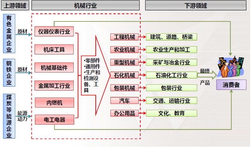 機(jī)械行業(yè)作為國(guó)民經(jīng)濟(jì)的裝備行業(yè),下游行業(yè)眾多,幾乎涉及到三大產(chǎn)業(yè)的各個(gè)方面。同時(shí),上游產(chǎn)業(yè)煤、電力等能源瓶頸行業(yè)和鋼鐵冶煉等原材料行業(yè)構(gòu)成機(jī)械行業(yè)的發(fā)展瓶頸,對(duì)行業(yè)發(fā)展制約性很大
